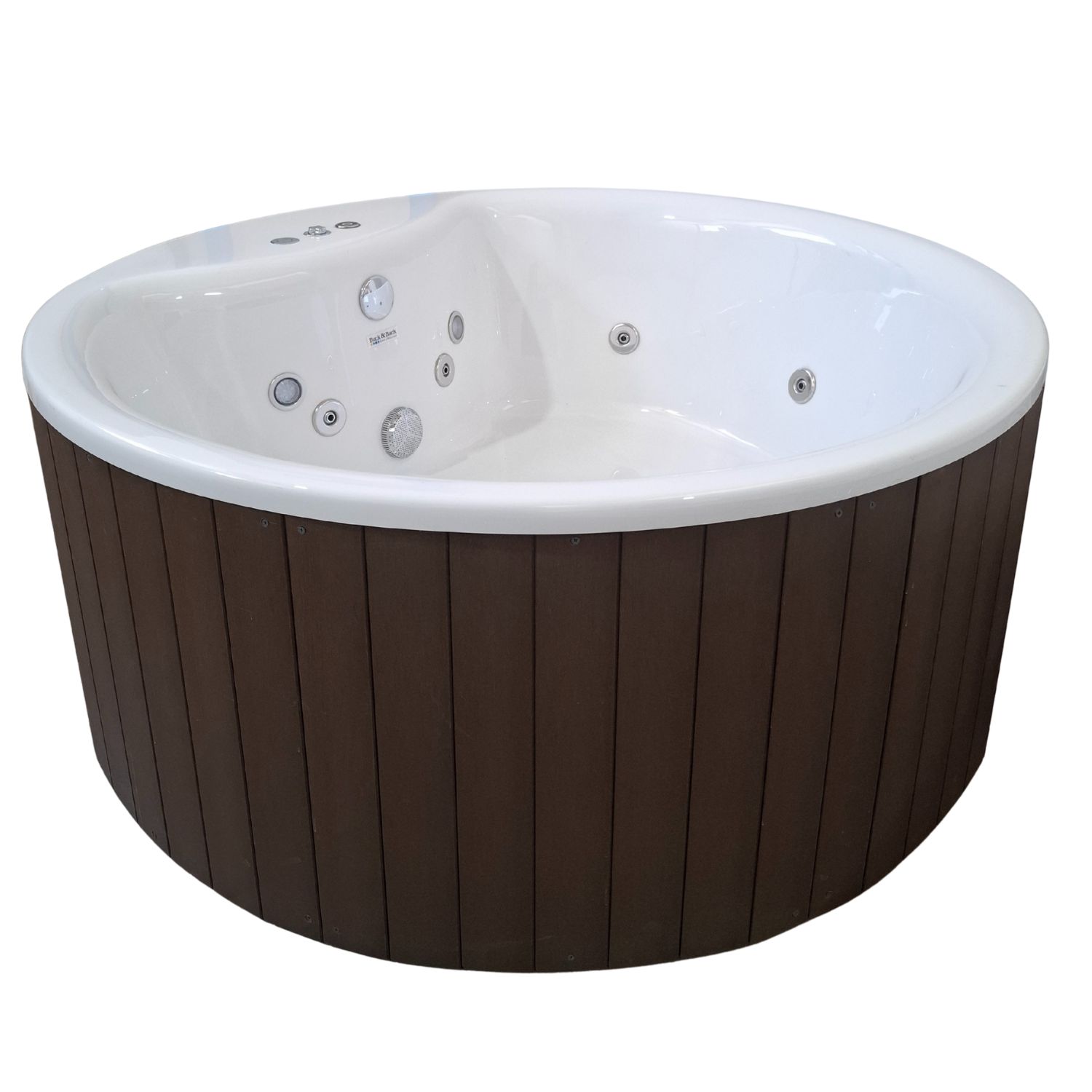 Tina Circular: perfecta para terrazas de cabañas boutique o escapadas románticas. Su diseño envolvente y sus jets estratégicamente ubicados crean una experiencia íntima y relajante